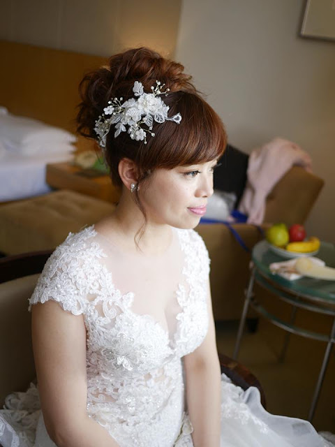 這套白紗的剪裁非常的典雅簡單 飾品挑選了跟禮服相搭配的蕾絲水晶片 在頭紗方面我幫詠清準備了素雅的長頭紗搭配 整體優雅端莊 加上他的好身材 讓好多賓客讚不絕口